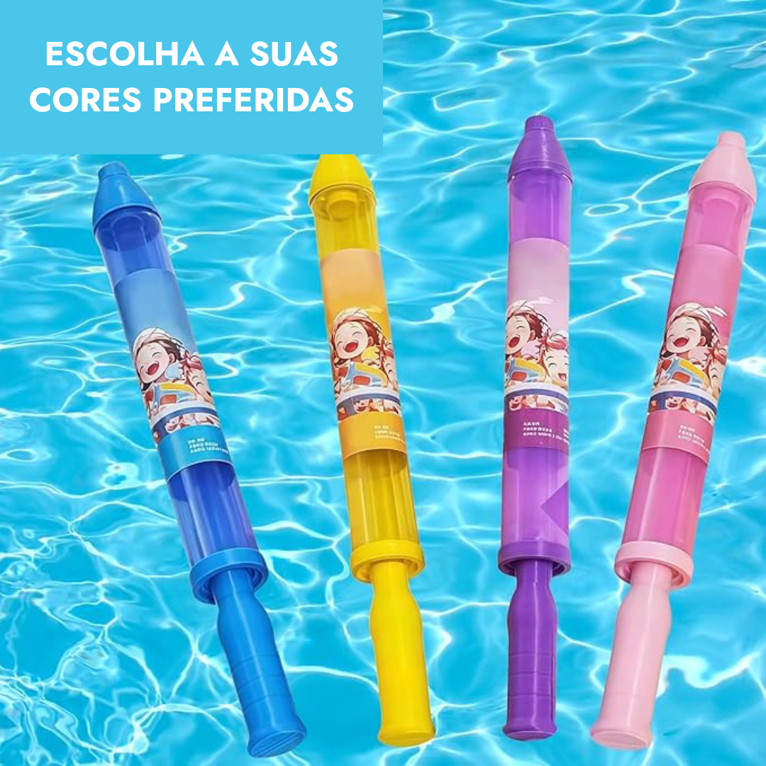 Você só puxa, mira e BOOM, a água voa pra todo lado num efeito que parece mágica. Nada de botões, nada de esperar. É ação imediata, daquele tipo que faz até adulto querer brincar.
